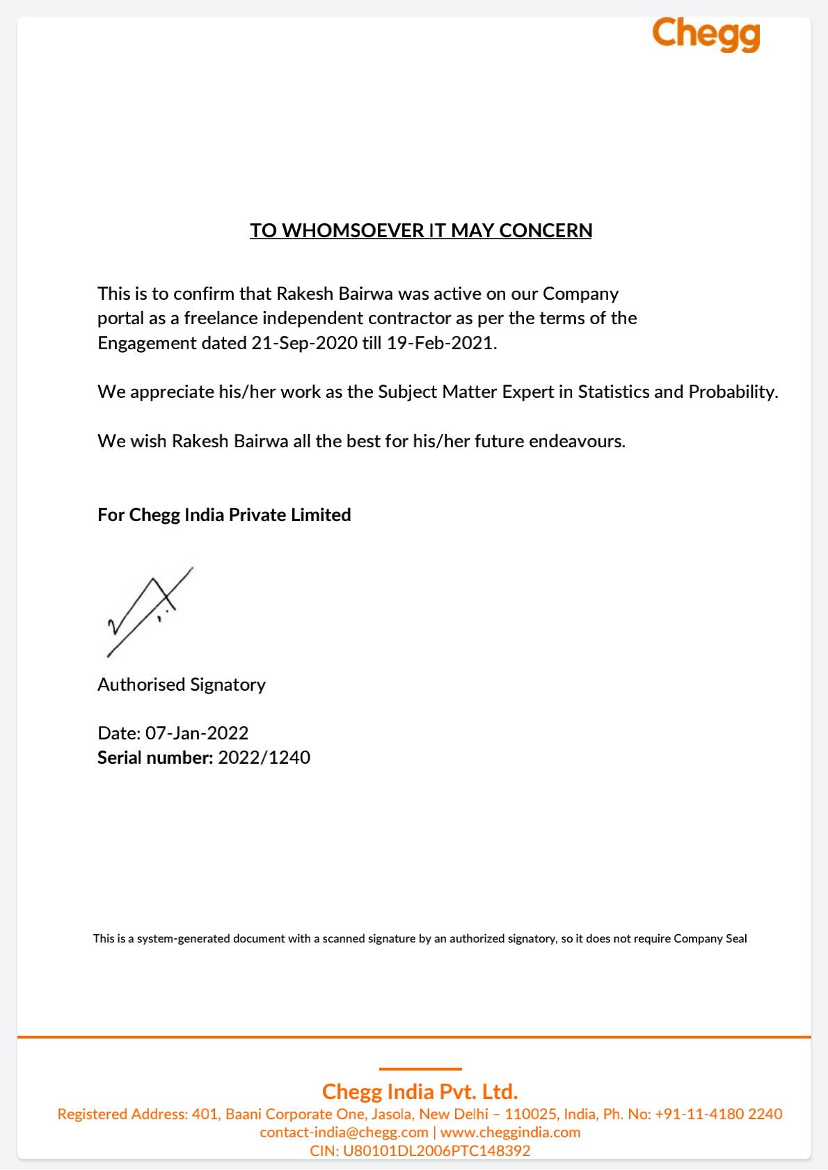 Worked as a subject matter expert in Chegg inc. for last 1 year.